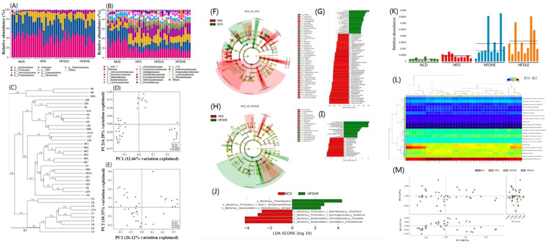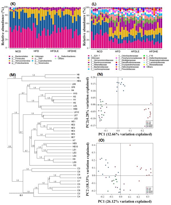 HFD導(dǎo)致小鼠腸道菌群的多樣性降低,然而NLE恢復(fù)了菌群多樣性(圖4)。Proteobacteria?、Epsilonproteobacteria、Helicobacteraceae?和Campylobacterales在HFD-HE組顯著富集(圖5H;5I),NCD與HFD-HE組的菌群結(jié)構(gòu)差異較?。▓D5J), NLE提高了HFD-HE和HFD-LE組Campylobacterales的豐度(圖5K)。NLE恢復(fù)了部分HFD導(dǎo)致的[K]轉(zhuǎn)錄和[G]碳水化合物代謝與運輸?shù)墓δ茴愋停▓D5L)。