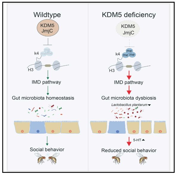 該研究從遺傳、環(huán)境和免疫因素進(jìn)行研究為“孤獨(dú)癥”的預(yù)防和治療提供了新思路。劉老師課題組以果蠅作為模型動物,發(fā)現(xiàn)遺傳因素調(diào)控了固有的免疫信號通路,進(jìn)而造成了以腸道菌群結(jié)構(gòu)為代表的內(nèi)環(huán)境因素紊亂,導(dǎo)致免疫因素的抑制性神經(jīng)遞質(zhì)5-羥色胺濃度升高。然而,抗生素或植物乳桿菌飼喂以及抑制固有免疫的過度激活均可改善了KDM5基因功能缺乏導(dǎo)致的果蠅社交孤獨(dú)樣的“社交”行為、壽命和細(xì)胞表型,最終揭示了組蛋白去甲基化酶KDM5通過免疫系統(tǒng)和腸道菌群調(diào)節(jié)果蠅社交行為的機(jī)制。