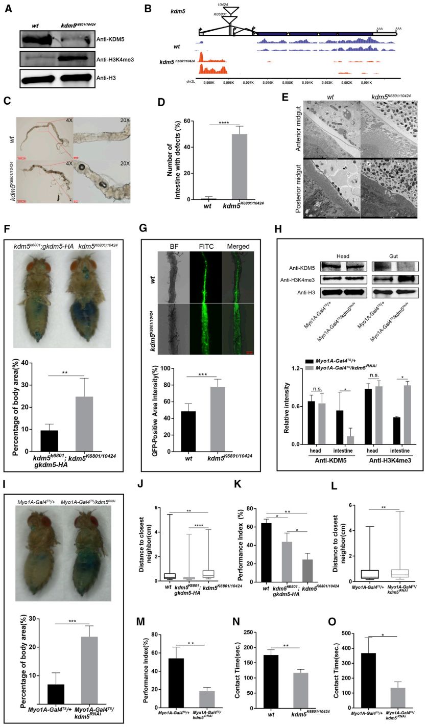 ?圖1. ?A:野生型(wt, w1118)和基因敲除型(kdm5K6801/10424)果蠅的KDM5, H3K4me3和組蛋白H3水平(Western blot);B:wt和kdm5K6801/10424果蠅腸道組織KDM5轉(zhuǎn)錄水平(RNA-seq);C:wt和kdm5K6801/10424果蠅消化道影像,紅框內(nèi)的斑點(diǎn)指示有腸道缺陷(氣泡);D:3-5齡wt和kdm5K6801/10424果蠅的腸道缺陷(氣泡)比例;E:透射電鏡觀察wt和kdm5K6801/10424果蠅前、后中腸上皮屏障;F:藍(lán)色食用染料標(biāo)記、測量wt和kdm5K6801/10424果蠅的腸滲透性;G:異硫氰酸熒光素(FITC)標(biāo)記的玻璃粉指示kdm5K6801/10424果蠅消化道滲透性較高;H:Myo1A-Gal4 TS/+和Myo1A-Gal4 TS/kdm5RNAi果蠅的頭、腸組織的KDM5, H3K4me3和組蛋白H3水平(Western blot);I:藍(lán)色食用染料標(biāo)記、測量Myo1A-Gal4TS/+和Myo1A-Gal4 TS/kdm5RNAi果蠅的腸滲透性;J、K和N:與wt果蠅相比,kdm5K6801/10424果蠅的接觸距離變遠(yuǎn)、交往活躍度下降、雌性社交接觸時間變短;L、M和O:與Myo1A-Gal4 TS果蠅相比,Myo1A-Gal4 TS/kdm5RNAi果蠅也發(fā)生了接觸距離變遠(yuǎn)、社交活躍度下降、雌性交往接觸時間變短。