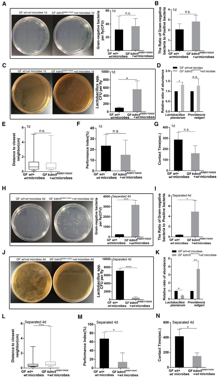 ?圖3. A-E:采用wt果蠅的菌群重塑后,1日齡無菌wt和kdm5K6801/10424果蠅的腸道革蘭氏陰性菌數(shù)量(CFU/只)、乳酸菌(Lactobacillus spp.)數(shù)量(CFU/只)、革蘭氏陰性菌與陽性菌的比例、L. plantarum L168和P. rettgeri P6相對豐度(RT-PCR)、接觸距離、社交活躍度、雌性交往接觸時間比較;F-N:采用wt果蠅的菌群重塑后,4日齡無菌wt和kdm5K6801/10424果蠅的比較(同上述A-E)。