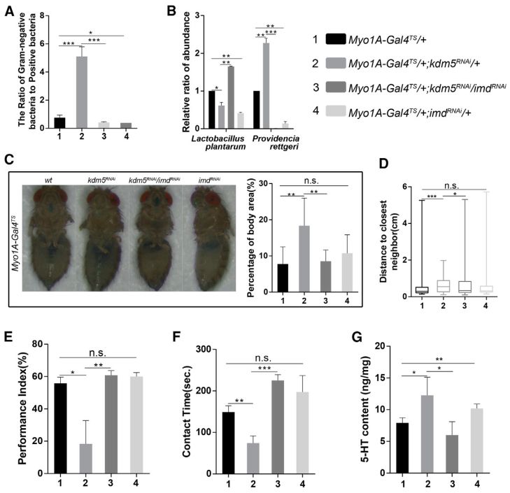 圖7. A:四組(Myo1A-Gal4TS/+、Myo1A-Gal4TS/+; kdm5RNAi/+、Myo1A-Gal4TS/+; kdm5RNAi/ imdRNAi和Myo1A-Gal4TS+; imdRNA/+)果蠅的腸道革蘭氏陰性菌與陽性菌的比例;B:四組(如圖A)果蠅的腸道L. plantarum L168和P. rettgeri P6相對豐度;C:四組果蠅的腸滲透性、接觸距離、交往活躍度、交往接觸時間、5-羥色胺(5-HT)濃度比較。