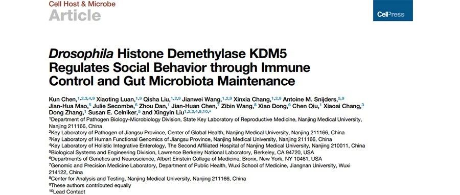 越來越多的研究表明,腸道菌群可以影響智力障礙(ID)和自閉癥譜系障礙(ASD)的疾病癥狀,盡管宿主的基因能夠影響腸道菌群,然而調(diào)控宿主共生菌群穩(wěn)態(tài)的分子機(jī)制在正常和疾病狀態(tài)下仍然未知。KDM5蛋白家族是一種轉(zhuǎn)錄調(diào)控因子,它通過組蛋白H3K4me3去甲基化修飾來發(fā)揮作用,然而在ID和ASD患者中,KDM5A/KDM5B/KDM5C發(fā)生了功能喪失型基因突變。果蠅的腸道菌群結(jié)構(gòu)簡單,遺傳和生理易于操控,可以為宿主-微生物的互作研究提供良好的體系,此外攜帶與人類KDM5C(kdm5A512P)致病錯義突變類似等位基因的果蠅表現(xiàn)出學(xué)習(xí)和記憶缺陷。與腸內(nèi)共生菌接觸的腸上皮細(xì)胞能夠細(xì)菌信號產(chǎn)生活性氧,劉老師課題組的前期研究發(fā)現(xiàn),KDM5能夠調(diào)節(jié)果蠅的細(xì)胞氧化應(yīng)激,因此本研究旨在探究KDM5通過調(diào)節(jié)腸道菌群來影響果蠅社交行為的機(jī)制。