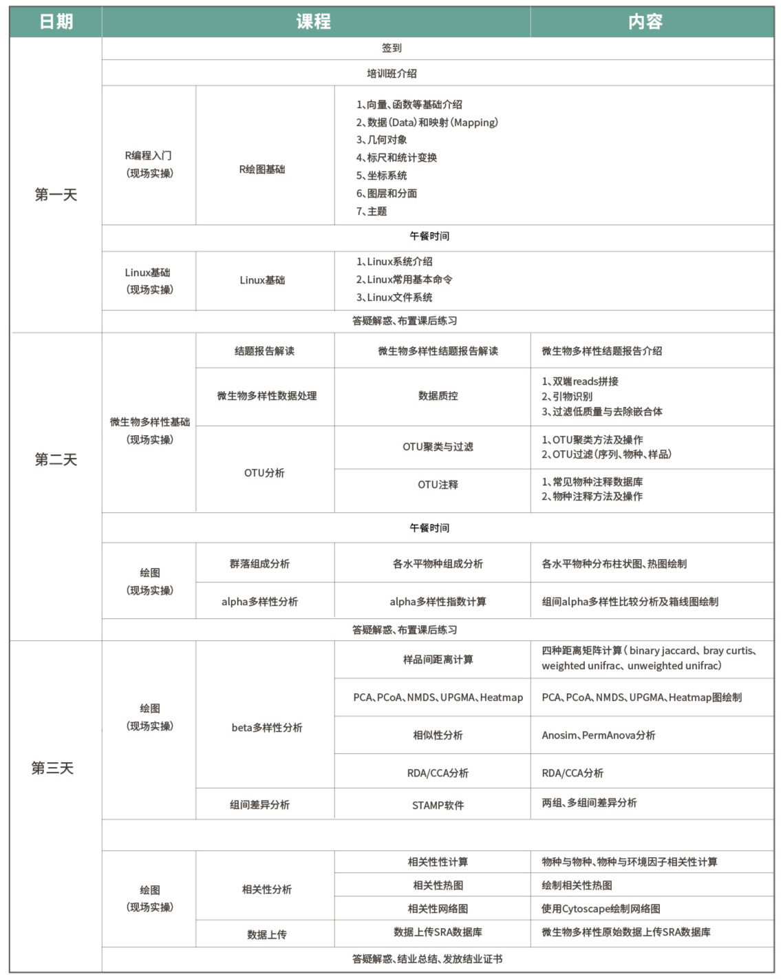 課程第一天為linux系統(tǒng)和R語言基礎的講解,帶大家熟悉分析中我們常用的命令與代碼,為后兩天的培訓打好基礎!第二、第三天的授課講師是我們的微生物部經手上千項目的研發(fā)經理,其從實際結果出發(fā),為大家講解具體的技術原理和計算方法,原理了解了,那就到具體實操了,從實操中發(fā)現問題從而解決問題那才真的干貨??紤]人多顧不上?您放心,我們現場還有助教,可以隨時溝通,保證學習通暢!