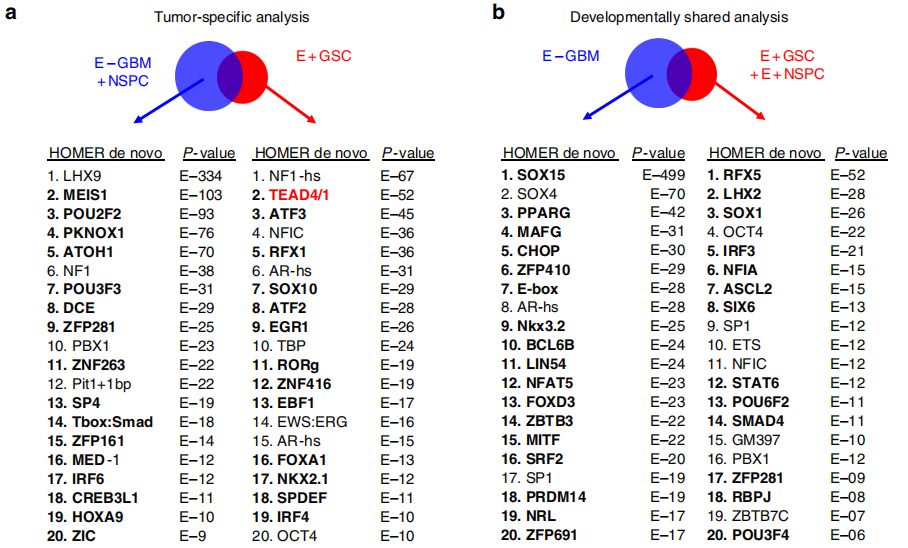 通過ATAC-seq分析染色質(zhì)的可及性,不僅可以識別轉(zhuǎn)錄的調(diào)控區(qū)域,還可以推斷出其中的TF活性。在此,作者鑒定了27個GSC腫瘤特異性的TF motif,26個在E+GSC和E+NSPC中共有的發(fā)育相關TF motif。其中,TEAD1/4是具有很高活性的TF( motif是GSC特有peak中顯著富集,且基因表達水平高),其它候選TF包括ATF3、RFX1、FOXA1等。而E+GSC和E+NSPC中共有的發(fā)育相關TF包括SOX1、IRF3、NFIA等。然后,作者利用以前的類似的E+/E-GBM的RNA-seq數(shù)據(jù),考慮到腫瘤特異性TF的基因表達水平,其中只有TEAD1在E+GSC中差異過表達。