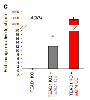 作者通過ATAC-seq和轉(zhuǎn)錄組測序數(shù)據(jù)篩選出來TEAD1的候選靶基因,并進一步利用ChIP-PCR,驗證了與TEAD1結(jié)合的靶基因–AQP4、EGFRCDH4。TEAD1敲除使AQP4下調(diào),TEAD1過表達可恢復AQP4的表達,而TEAD1和AQP4過表達均可修復TEAD1KO細胞的遷移缺陷,說明TEAD1作用于靶基因AQP4,調(diào)控其表達,進而參與GBM遷移的直接調(diào)控機制。