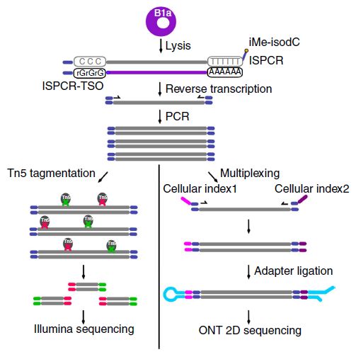 單個基因不同轉(zhuǎn)錄本isoform產(chǎn)生的蛋白質(zhì)具有不同的生物特性,包括穩(wěn)定性、細胞內(nèi)定位、酶活性和翻譯后修飾。Isoform是可選擇性轉(zhuǎn)錄起始位點(transcription start sites,TSS)、轉(zhuǎn)錄終點(transcription end sites,TES)和可變剪接事件等的產(chǎn)物。據(jù)預測,大部分人類基因存在可變剪接??勺兗艚油蛔兣c人類遺傳病和腫瘤均密切相關(guān)。故而,不僅需要在基因水平鑒定轉(zhuǎn)錄組多樣性,也需要在轉(zhuǎn)錄本表達水平分析細胞真正的轉(zhuǎn)錄多樣性。二代轉(zhuǎn)錄組測序弊端:目前基于二代平臺的短讀長RNAseq方法在識別復雜轉(zhuǎn)錄本isoform方面存在固有限制,因為它們不能測序全長轉(zhuǎn)錄本。相反,轉(zhuǎn)錄本被片段化以進行測序,其產(chǎn)生的單個短reads無法跨越整個轉(zhuǎn)錄本。算法工具可用于從這些reads中組裝完整的轉(zhuǎn)錄本,但不同的組裝算法可能會導致相互矛盾的結(jié)果,整體組裝質(zhì)量良莠不齊。為了克服二代短讀長RNAseq的這種限制,出現(xiàn)了基于三代測序平臺的全長轉(zhuǎn)錄本測序,比如ONT平臺全長轉(zhuǎn)錄組測序技術(shù)。研究表明,在看似同質(zhì)的細胞群體中各個細胞在基因表達方面可能不同。細胞間異質(zhì)性使免疫細胞成為深入分析轉(zhuǎn)錄多樣性的靶標。研究目的:通過使用ONT技術(shù)對全長cDNA分子進行測序,探究小鼠B1a細胞的單細胞轉(zhuǎn)錄組多樣性。