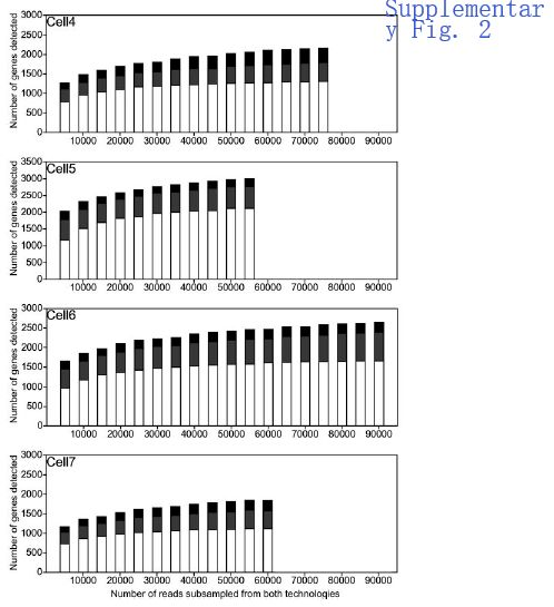 3. 7個B1a細胞全長cDNA分別進行二代Illumina轉(zhuǎn)錄組測序(73,086-351,876 150?bp reads/細胞)和三代ONT全長轉(zhuǎn)錄組測序(R 7.3 17,749-52,696/R9.4 57,874-128,726 ONT reads/細胞),二者間進行比較。