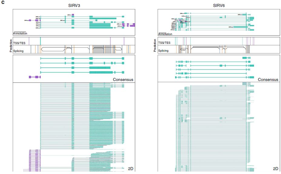 人工合成標準品?Spike-in RNA Variant Control Mixes (SIRVs, Lexogen,根據(jù)7個人類基因結(jié)構(gòu)設計而成的,其中每個基因結(jié)構(gòu)有6-18種轉(zhuǎn)錄本變異,因此總共有69種轉(zhuǎn)錄本,這些轉(zhuǎn)錄本全面的解決了可變剪接、可變轉(zhuǎn)錄起始點和終止位點、重疊基因和反義轉(zhuǎn)錄問題),分別進行二代Illumina轉(zhuǎn)錄組測序和三代ONT全長轉(zhuǎn)錄組測序,二者間進行比較。