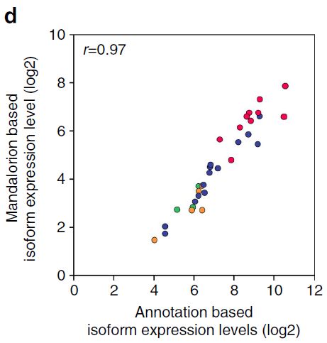 根據(jù)其TSS/TES和可變剪接位點的使用將ONT reads分類為isoform組,并生成一致性序列,共計33個一致性序列,與其對應的SIRV轉(zhuǎn)錄本之間具有97.8-100%相似性,且方向一致。26個一致性序列匹配2個高豐度組中存在的29個SIRV轉(zhuǎn)錄本之一(下圖c)。不依賴于基因組注釋的轉(zhuǎn)錄本isoform?Mandalorion分類定量與reads直接與轉(zhuǎn)錄組比對得到的定量結(jié)果之間的高度相關(guān)性(下圖d)。