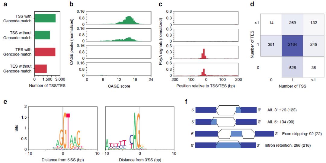 通過對ONT全長轉(zhuǎn)錄組數(shù)據(jù)分析,鑒定到4234個TSS和3883個TES,僅有2476個TSS和2448個TES與小鼠基因組的Gencode數(shù)據(jù)庫(vM10)中存在的TSS或TES重疊。(下圖a)為了確定TSS和TES鑒定的z確性,作者分析了Fantom5數(shù)據(jù)庫中 CAGE peak和polyA信號富集,F(xiàn)antom5 CAGE峰來源于轉(zhuǎn)錄本5’末端的捕獲和測序,因此應在TSS中富集。實際上,與TES(49/3883或1.3%)相比,高比例的注釋(2356/2476或95%)和未注釋(1052/1799或58%)TSS與高得分的Fantom5 CAGE峰重疊(下圖b)。相反,注釋和未注釋的TES都高度富集polyA信號,而TSS則沒有(下圖c)。如預期的那樣,大多數(shù)基因恰好包含一個TSS和一個TES。然而,696個基因含有1個以上的TSS或TES,表明存在一種以上的isoform(下圖d)??傊瑔蝹€細胞ONT RNA-seq成功鑒定了數(shù)千個未注釋的TSS和TES以及數(shù)百個具有差異TSS/TES使用的基因。
