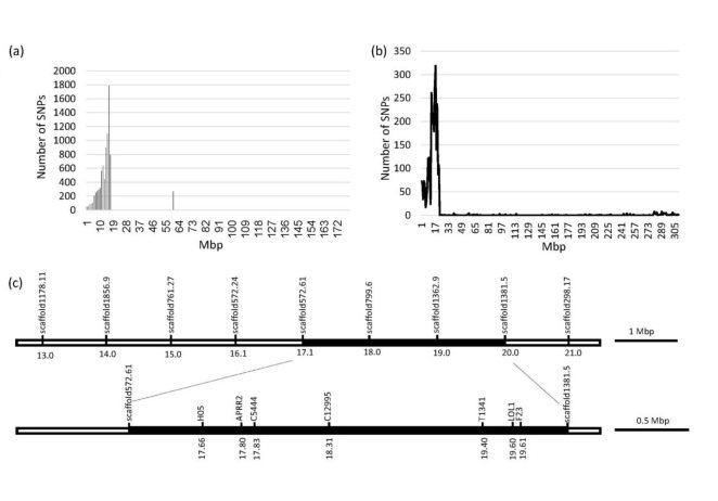 圖3. 混池間SNPs分布(a. BSA-seq與b. BSR-seq)及pc1區(qū)域物理圖譜(c.)