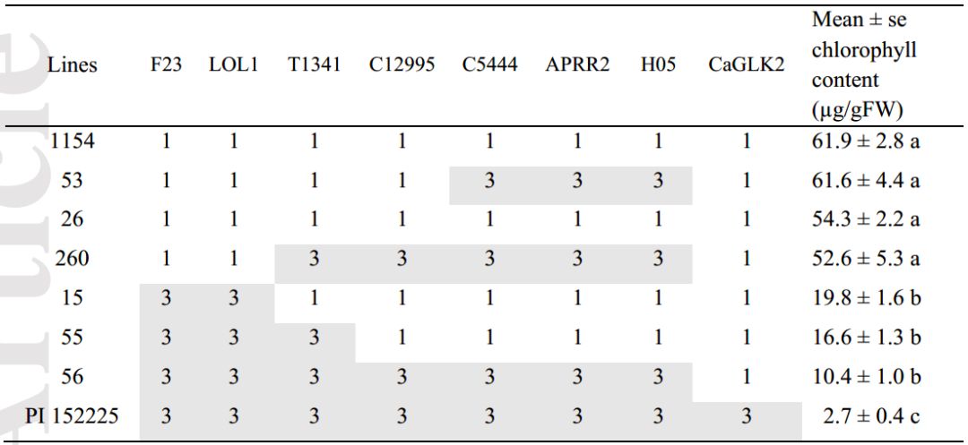 為進一步精細定位pc1,本研究對624個F2(1154 × NIL 86-45)單株標記分型以篩選QTL區(qū)域內的交換單株?;谇捌谘芯?,標記T1341與QTL peak連鎖最為緊密 (Brand et al., 2012),作者又在T1341附近開發(fā)出6個標記,在標記F23與H05間,共篩選出34個F4交換單株,可代表6種基因型組合,橫跨Chr.1:5cM的區(qū)間。為排除pc1pc10互作的影響,作者將所有交換單株的CaGLK2固定為1154等位基因。結果分析暗示,F(xiàn)23與LOL1是與QTL連鎖最為緊密的標記,因為line 15含PI 152225最短的導入片段且葉綠素含量顯著低于1154,而line 260在這2個標記間含1154等位且與1154葉綠素含量沒有顯著性差異。此外,lines 53與260在APRR2-like位點含有PI 152225等位,葉綠素含量卻與1154沒有顯著差異,暗示此基因(APRR2)在本研究中的遺傳背景下不影響葉綠素含量(表1.)。