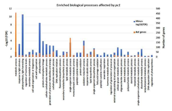 為研究pc1參與影響的細胞學過程,本研究對混池間983個差異表達基因進行GO富集分析并根據(jù)生物過程進行分類(圖5)。最顯著的GO term過程與光合作用及氧化還原有關,這兩個過程包含184個DEGs,被分成17個亞類,其中最大的一類是氧化還原過程。這一類基因與葉綠素合成下調有關,例如,POR,CAOHEMA1,還與葉綠素降解基因上調有關,例如,CA00g73130,暗示葉綠素合成與降解受這個QTL調控。另一類重要基因,包含Chlorophyll a/b-結合蛋白的多個成員基因(CA01g17090,CA02g12050,CA02g12060,CA02g12070等),在淡綠混池中下調表達,它們參與光合、蛋白發(fā)色團及光刺激響應等過程。另外,若干與碳固定有關的Rbc家族基因在淡綠混池中也呈現(xiàn)下調表達。