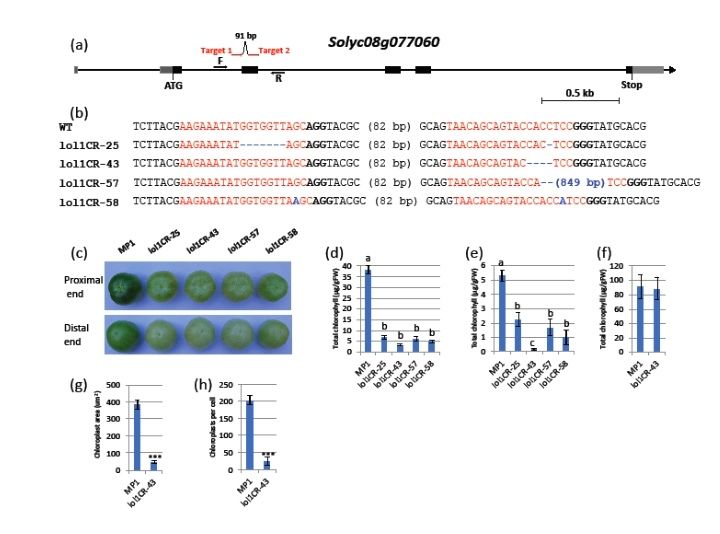 為證明CcLOL1參與調控葉綠體發(fā)育與葉綠素含量,本研究利用CRISPR/Cas9技術敲除番茄栽培種MP1中的辣椒同源基因Solyc08g077060SlLOL1)獲得突變體。首先設計兩個gRNAs靶定exon 2,兩者相距91 bp;然后遺傳轉化番茄MP1,經(jīng)陽性苗篩選,檢測,最終獲得4類突變體lol1CR-25,lol1CR-43,lol1CR-57lol1CR-58,或缺失,或插入,經(jīng)T1與T2代測序驗證獲得純合突變體(圖 6.a,b)。
