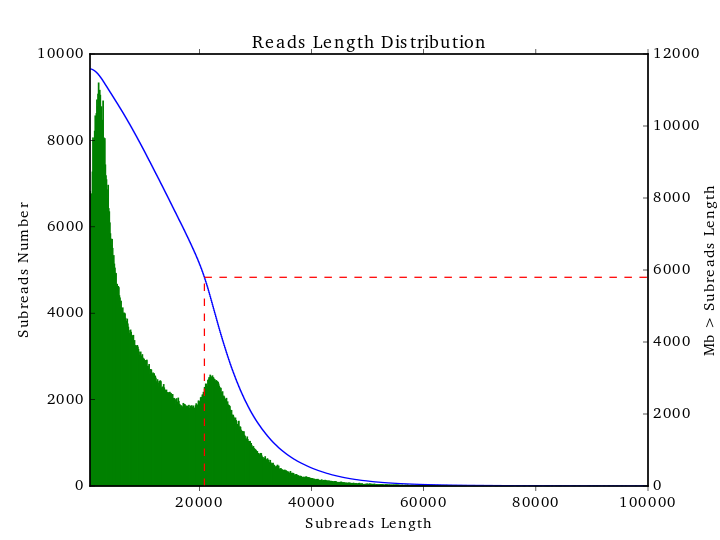 注:Subreads是產(chǎn)出的所有subreads數(shù)據(jù)集;Reads Num:reads數(shù)目;Total Bases (bp):堿基總數(shù);Reads N50 (bp):將reads從長到短排序,并依次相加,當加和等于總堿基數(shù)目一半時對應的那條reads長度即為reads N50;Mean Length (bp):reads的平均長度;Longest Read (bp):最長read的長度。