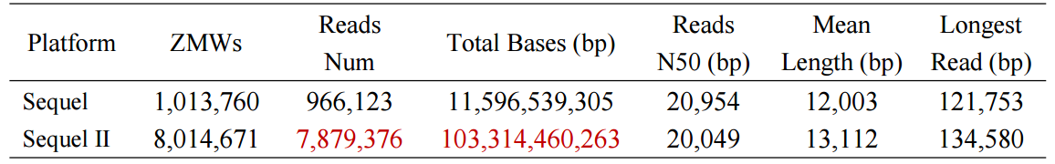 百邁客利用某海洋動物樣本通過構建相同文庫,進行不同平臺的數(shù)據(jù)測試。通過構建20 Kb的文庫,同時在Sequel與SequelⅡ上進行上機測序,數(shù)據(jù)產(chǎn)出結果如下所示: