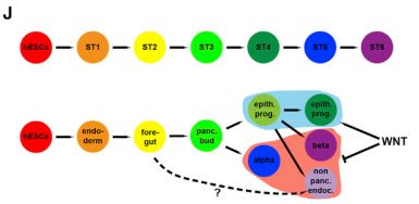 體外分化方法的最終目標(biāo)是為糖尿病患者提供源自多能干細(xì)胞的β細(xì)胞而不是移植胰島。然而,應(yīng)該注意到,目前實(shí)施的醫(yī)療方案涉及全胰島移植,而不是單獨(dú)的β細(xì)胞。事實(shí)上,移植單細(xì)胞類型無法確定是否能夠重新獲得整個(gè)胰島的功能。因此,致力于在體外產(chǎn)生完整的胰島比純粹的β細(xì)胞群更有意義。文章嘗試在體外單細(xì)胞水平產(chǎn)生胰腺內(nèi)分泌細(xì)胞的方法。作者通過scRNA-seq產(chǎn)生了一個(gè)無偏的大數(shù)據(jù)集,這使得能夠表征所產(chǎn)生的各種細(xì)胞類型,它們的分化時(shí)間以及鑒定影響細(xì)胞命運(yùn)的分子途徑。長遠(yuǎn)來看,精細(xì)調(diào)整祖細(xì)胞與內(nèi)分泌命運(yùn)的時(shí)間和平衡的能力可用于控制α和β細(xì)胞之間的比例,并促進(jìn)具有適當(dāng)細(xì)胞組成的胰島的體外形成。