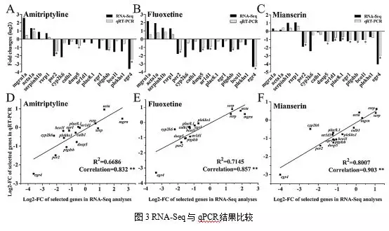 作者為了更好地了解不同種類抗抑郁藥誘導(dǎo)的毒性反應(yīng)在非靶向魚類中的作用機(jī)制,用分屬于不同抗抑郁藥物類別的阿米替林(Amitriptyline hydrochloride)、氟西?。‵luoxetine hydrochloride)和鹽酸米安色林(mianserin hydrochloride)對(duì)早期發(fā)育階段的斑馬魚胚胎進(jìn)行處理,然后進(jìn)行了轉(zhuǎn)錄組測(cè)序(RNA-Seq),基于前面轉(zhuǎn)錄組的分析結(jié)果,作者采取兩組qPCR驗(yàn)證實(shí)驗(yàn):