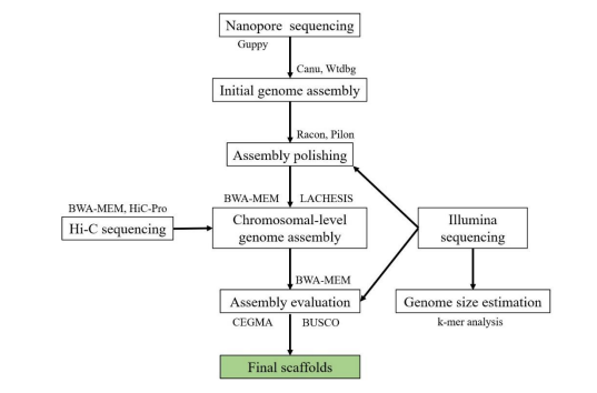 占比地球容量71%的海洋中蘊(yùn)藏著豐富的生物資源,而海洋生物體內(nèi)多糖和蛋白含量較高,以及部分海洋生物極易死亡腐敗從而引起DNA的降解,給高純度、完整的基因組DNA的獲取帶來了極大的困難。而海洋生物通常與陸生動(dòng)植物相比更為復(fù)雜,組裝拼接的難度更大。本次研究使用Nanopore測(cè)序技術(shù)突破了這些瓶頸,完成了海洋魚類超高質(zhì)量的基因組組裝!研究中使用104X Nanopore測(cè)序數(shù)據(jù)進(jìn)行基因組組裝,通過Canu、WTDBG等多款軟件分別進(jìn)行組裝,選取組裝結(jié)果(主要從基因組大小,contig N50,組裝完整性,組裝準(zhǔn)確性等方面評(píng)估)進(jìn)行后續(xù)研究優(yōu)化。研究者最終使用WTDBG軟件組的基因組版本結(jié)合Hi-C技術(shù)的進(jìn)一步優(yōu)化,組裝完成474.31 Mb基因組,并將99.44%的基因組掛載至20條染色體上,?ContigN50提升至22.46 Mb,且最長的Contig達(dá)到32.32 Mb!