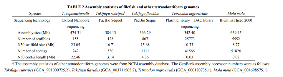 而與近年的一些魚類基因組ContigN50相比,綠鰭馬面鲀基因組組裝的連續(xù)性同樣也是表現(xiàn)超群。從表2中不難發(fā)現(xiàn),近年來魚類基因組ContigN50水平基本在Kb與Mb之間徘徊,而本次使用Nanopore組裝的綠鰭馬面鲀直接上升了一個(gè)數(shù)量級(jí),完成了連續(xù)性超強(qiáng)的優(yōu)質(zhì)基因組。