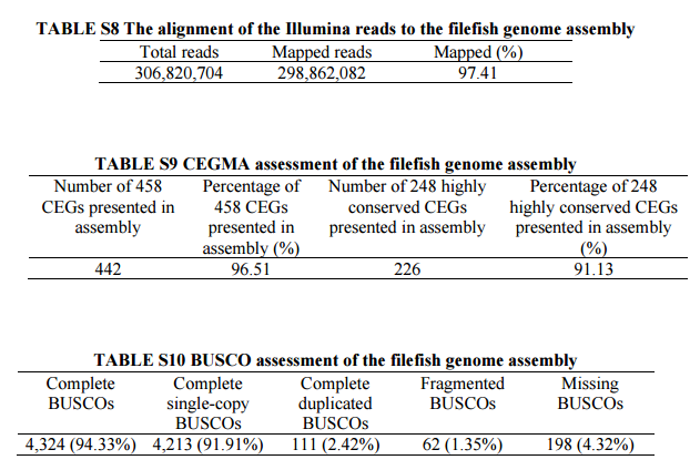 眾所周知,Contig N50是衡量基因組組裝質(zhì)量好壞的一個(gè)重要指標(biāo),一定程度上來說,ContigN50值越高表示組裝的質(zhì)量越好。與已有鲀形目基因組比較,綠鰭馬面鲀基因組組裝的ContigN50超過了同樣使用三代測(cè)序進(jìn)行組裝的黃鰭東方鲀(Takifugu flavidus)的5倍,更是超過了翻車魚(Mola mola)的1000倍!
