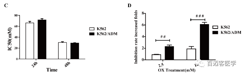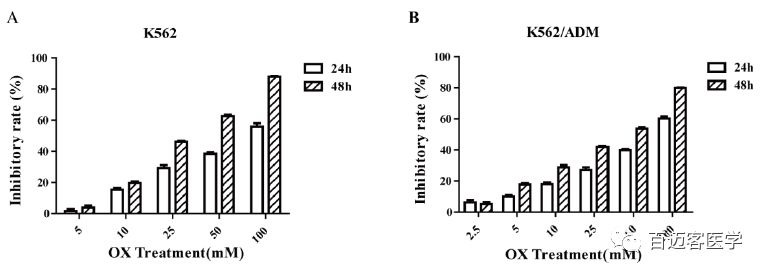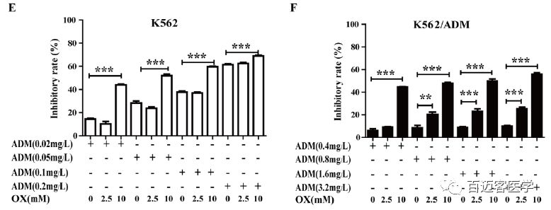 如圖,單獨(dú)用草酸處理的兩個(gè)細(xì)胞系均呈現(xiàn)時(shí)間和劑量依賴性細(xì)胞毒性,但是細(xì)胞毒性相對(duì)較低。相比于單獨(dú)用ADM處理,用ADM和草酸聯(lián)合處理后,K562細(xì)胞和K562/ADM細(xì)胞增殖抑制率分別提高了為2.28±0.56倍和6.08±0.77倍,K562/ADM細(xì)胞增殖抑制率的增加倍數(shù)明顯高于K562細(xì)胞。