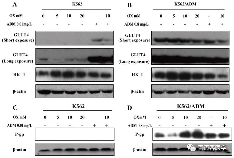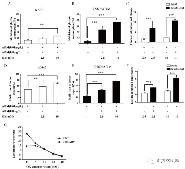 在上述試驗(yàn)中,作者發(fā)現(xiàn)ADM聯(lián)合草酸處理增加了人白血病細(xì)胞的細(xì)胞毒性。然后,作者研究了草酸對(duì)ADM處理的K562和K562/ADM細(xì)胞系糖代謝作用的影響,發(fā)現(xiàn)相比于ADM單獨(dú)處理,ADM和草酸共同處理48h后,兩個(gè)細(xì)胞系的葡萄糖消耗和乳酸生成的抑制作用均有所增強(qiáng)。草酸導(dǎo)致兩種細(xì)胞系糖酵解抑制呈現(xiàn)劑量依賴性增加,而耐藥細(xì)胞糖酵解抑制的變化倍數(shù)更高,這與聯(lián)合處理時(shí)耐藥細(xì)胞療效升高倍數(shù)更高所一致,說明草酸對(duì)糖酵解的抑制導(dǎo)致葡萄糖消耗和乳酸生成的減少,導(dǎo)致白血病細(xì)胞對(duì)ADM的敏感性增加。