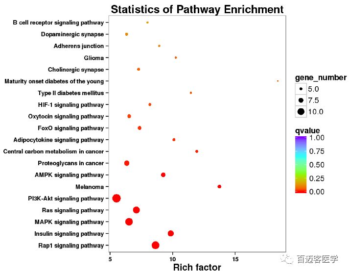 此外,KEGG聚類和富集分析顯示,與K562細(xì)胞相比,K562/ADM細(xì)胞中存在多個(gè)生物學(xué)過程的變化。為了進(jìn)一步闡明糖代謝重編程的分子機(jī)制,將DEG比對(duì)到參與葡萄糖代謝的相關(guān)信號(hào)轉(zhuǎn)導(dǎo)途徑。所有DEG都是比對(duì)到了信號(hào)轉(zhuǎn)導(dǎo)途徑,如MAPK、PI3K-AKT、HIF、Ras等。如圖,PI3K-AKT通路是DEG富集最多的通路。PI3K-AKT通路通過調(diào)節(jié)代謝分子(包括LDHA、HK-II和GLUT)的表達(dá)或移位,作為代謝穩(wěn)態(tài)的關(guān)鍵調(diào)控因子。結(jié)果顯示,PI3K-AKT通路是K562/ADM細(xì)胞中最富集的上調(diào)通路,與糖代謝重編程和MDR的發(fā)展有關(guān)。