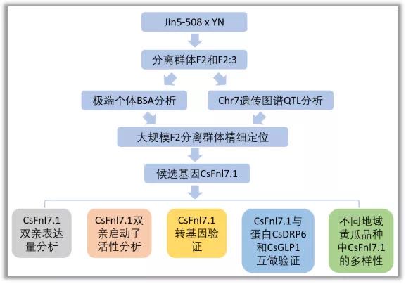 本研究首先通過長果把品種Jin5-508和短把品種YN雜交構(gòu)建的性狀分離群體(F2和F2:3),從F2中選擇果把長度極端個體構(gòu)建DNA混池進行高通量測序,BSA分析和傳統(tǒng)遺傳圖譜共同在7號染色體上定位到一個主效QTL。再通過分離群體精細定位、基因表達分析、轉(zhuǎn)基因驗證等方法確定了調(diào)控果把長度基因CsFnl7.1。同時發(fā)現(xiàn)CsFnl7.1啟動子區(qū)域的多態(tài)性調(diào)控CsFnl7.1的表達水平。結(jié)合自然群體材料的多樣性分析,發(fā)現(xiàn)CsFnl7.1位點可能起源于印度。