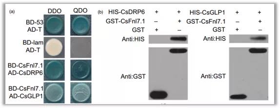 利用酵母雙雜技術,以CsFnl7.1蛋白為誘餌篩選與其互做的蛋白,結(jié)果顯示共得到53個陽性克隆,在這些蛋白中有多個與細胞伸展相關,包括CsDRP6和CsGLP1(圖8a)。體外pull down實驗顯示,融合蛋白HIS-CsDRP6和HIS-CsGLP1可以被GST-CsFnl7.1高效捕獲,而對照GST則不能(圖8b)。以上結(jié)果充分說明CsFnl7.1與CsDRP6、CsGLP1之間存在互做關系。