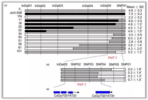 為驗證BSA的定位結(jié)果,作者在3個不同環(huán)境下調(diào)查了102個F2:3家系(Jin5-508 ×?YN)的表型,結(jié)果顯示F2:3表型也符合正態(tài)分布(圖3a)?;陔p親重測序數(shù)據(jù),作者在7號染色體上開發(fā)了72個雙親多態(tài)標記(SNP和InDel),用這些標記合F2群體構(gòu)建7號染色體的連鎖圖譜。結(jié)合F2:3群體3個環(huán)境的表型以及F2遺傳圖譜,共同定位到了1個主效QTL(圖3b),表型貢獻率在27.9%-32.7%。綜合BSA定位和遺傳圖譜定位結(jié)果,最終吧QTL Fnl7.1定位在7號染色體上2.85Mb的區(qū)間內(nèi)。