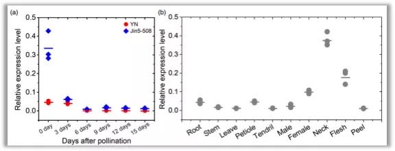選擇雙親授粉后0-15天幼瓜進行CsFnl7.1的表達量分析,qRT-PCR結(jié)果顯示授粉后6個時間點,CsFnl7.1在雙親中表達差異不顯著,而且表達量表現(xiàn)出持續(xù)降低(圖5a)。但是,在授粉當天,CsFnl7.1在Jin5-508中表達量顯著高于YN。組織特異表達分析顯示,CsFnl7.1在果把中表達量最高(圖5b)。?