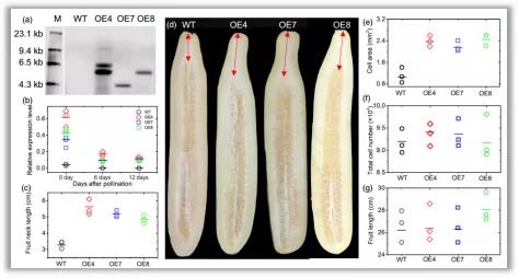 為進一步驗證基因功能,作者將CsFnl7.1轉(zhuǎn)入短把品種“D8”中,得到3個T2代單株(OE4、OE7和OE8)。Southern雜交顯示OE4、OE7和OE8分別插入1、1和2個拷貝(圖7a)。與對照相比,3個轉(zhuǎn)基因個體CsFnl7.1表達量顯著提高,同時果把長度也更長,說明CsFnl7.1確實能夠影響果把長度(圖7b,c,d)。分析果把果肉細胞的個數(shù)和大小發(fā)現(xiàn),轉(zhuǎn)基因個體比對照個體細胞更大,但細胞數(shù)在兩者之間沒有顯著差異(圖7e,f,g),從而說明CsFnl7.1是通過調(diào)控細胞伸展來影響果把長度。