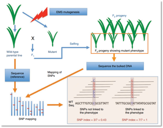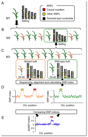 (1)該文章是對(duì)突變性狀定位的一種延伸,也是對(duì)mutmap方法的一個(gè)補(bǔ)充,主要區(qū)別是如果隱形突變個(gè)體無法正常發(fā)育在幼苗期出現(xiàn)死亡,因此無法與野生親本雜交構(gòu)建分離群體,所以該方法巧妙的選擇了突變位點(diǎn)雜合的個(gè)體進(jìn)行自交,從而在自交M3或者M(jìn)4選擇極端個(gè)體構(gòu)建混池進(jìn)行后續(xù)分析。