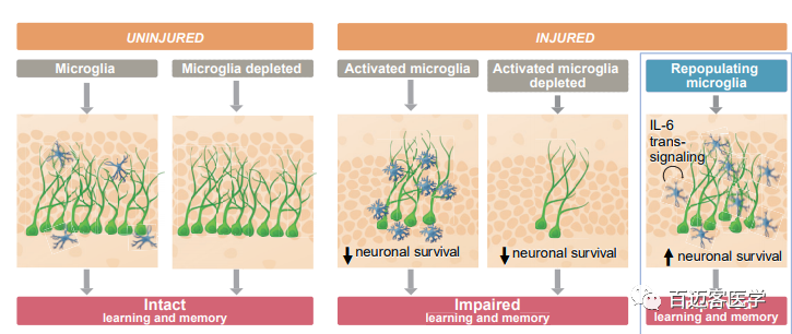 在受到損傷影響的大腦區(qū)域中,激活的小膠質(zhì)細(xì)胞的存在不一定對(duì)結(jié)果和/或認(rèn)知功能障礙有負(fù)面影響,相反,在受損傷后的大腦中,激活的小膠質(zhì)細(xì)胞似乎大多缺乏支持內(nèi)源性修復(fù)過(guò)程的能力。然而,在哺乳動(dòng)物的大腦中和再生生物體如蠑螈和斑馬魚,可以誘導(dǎo)出一種可再生的小膠質(zhì)細(xì)胞表型,炎癥信號(hào)在其中發(fā)揮了關(guān)鍵作用。本文已經(jīng)發(fā)現(xiàn)了IL-6信號(hào)通路與這種有益表型相關(guān)的關(guān)鍵作用,未來(lái)的研究可以進(jìn)一步確定如何利用小膠質(zhì)細(xì)胞再生的獨(dú)特表型特征進(jìn)行治療。