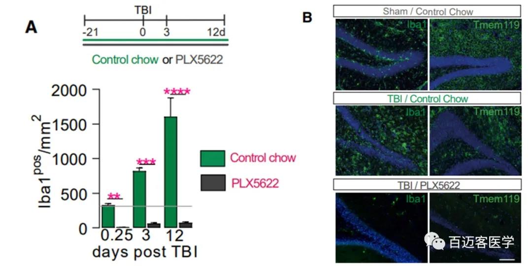 首先通過(guò)喂食小鼠集落刺激因子-1受體(CSF-1R)拮抗劑PLX5622 ,使小膠質(zhì)細(xì)胞衰竭,來(lái)檢查外傷性腦損傷(TBI)后小膠質(zhì)細(xì)胞缺失是否會(huì)改變海馬依賴任務(wù)中的認(rèn)知結(jié)果。用可控皮質(zhì)撞擊造成TBI,在腦外傷前3周開始持續(xù)給藥PLX5622,可導(dǎo)致大范圍的Iba1pos?、TMEM119pos細(xì)胞的丟失,包括海馬區(qū)。在腦外傷后的整個(gè)實(shí)驗(yàn)時(shí)間內(nèi),海馬區(qū)保持95%的功能缺失。這些結(jié)果與喂食食物的小鼠對(duì)照組形成鮮明對(duì)比。在腦外傷后的12天內(nèi),海馬內(nèi)的Iba1pos細(xì)胞數(shù)量是假手術(shù)組的5倍。