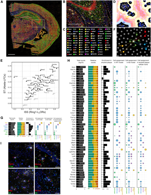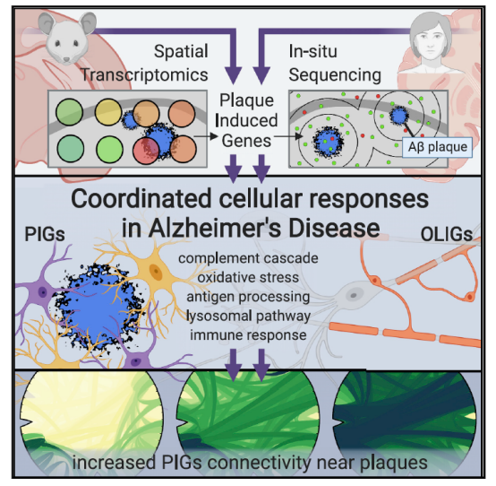 簡述:本文結(jié)合空間轉(zhuǎn)錄組(ST)和原位測序(ISS)研究人鼠大腦,揭示了兩種由淀粉樣蛋白斑沉積誘導的的阿爾茲海默癥(AD)多細胞基因網(wǎng)絡—-斑塊誘導基因(PIG)網(wǎng)絡和少突膠質(zhì)細胞基因(OLIG)響應。
