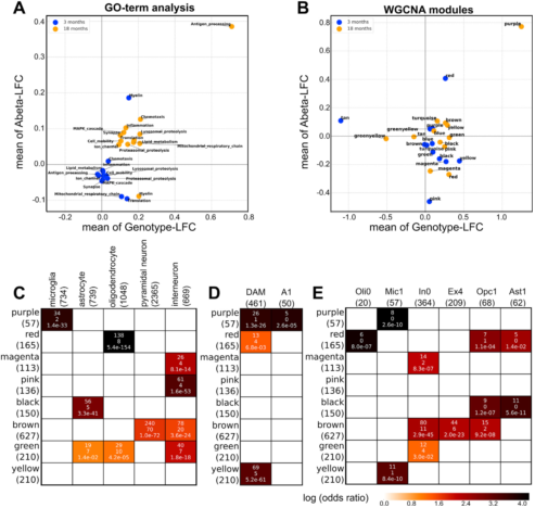 具有相似表達模式的基因很可能擁有相似的功能,因此可以通過加權(quán)基因共表達網(wǎng)絡分析(WGCNA)進行模塊聚類。作者研究了10327個轉(zhuǎn)錄譜中變化程度*大的50%的基因,識別出12個模塊,并使用GOrilla提取了可能的生物學功能、Aβ暴露的表達變化、3月齡和18月齡的基因型、細胞特征、受影響的腦區(qū)。