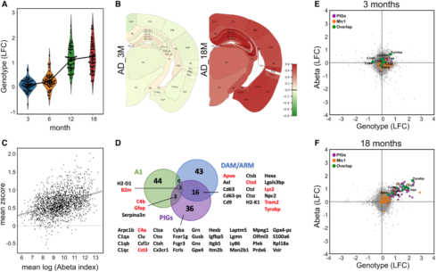作者進一步研究了PIG模塊的細胞學特征,鑒定出其與激活的小膠質(zhì)細胞(疾病相關(guān)DAM或者激活響應的ARM)和炎性星形膠質(zhì)細胞(A1)有關(guān)聯(lián)(圖S3D)。重點突出了5個與A1標記重疊的PIGs和15個DAM/ARM 基因(圖3D)。另外36個PIGs以前并沒有被定義為疾病相關(guān)的神經(jīng)膠質(zhì)基因。激活的小膠質(zhì)細胞和星形膠質(zhì)細胞參與了前十的聯(lián)系*緊密的樞紐基因(圖3D,紅色)。作者評估這些PIGs是否可以在人數(shù)據(jù)庫中被鑒定出來。在41個細胞亞群中,與PIGs*相關(guān)的是AD相關(guān)的小神經(jīng)膠質(zhì)細胞(Mic1,圖S3E)。作者通過參與Aβ暴露和基因型的人Mic1??Marker基因的同源序列來放大基因表達變化(圖3E&F,橙&綠)。對小鼠的分析表明,人腦中的Mic1反應是對淀粉樣蛋白斑塊的大量的多細胞協(xié)調(diào)反應的一部分,而且這種反應會隨著時間的推移而演變。