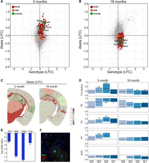 類似于髓鞘類(圖S3A),與3月齡和18月齡的WT小鼠相比,AppNL-G-F小鼠在OLIG模塊的基因型軸線全腦范圍上全部上調(diào)(圖6A&6B)。這種基因型效應可能反映了小鼠大腦對人源和突變的App基因的整體反應。但是,從基因型中把Aβ暴露(Aβ軸)分理出后,作者發(fā)現(xiàn)了一個OLIG模塊的有趣變化:在3個月時,全部呈正相關(guān),在18個月時為負相關(guān)(圖6A&6B)。在不同的大腦區(qū)域,這種反應也有明顯的差異(圖6C)。比較圖2C中淀粉樣蛋白斑和OLIG表達,可以明顯發(fā)現(xiàn)OLIG表達的主要驅(qū)動因素不是Aβ指標而是大腦區(qū)域本身(圖6C)。在3月齡時,作者發(fā)現(xiàn)在纖維束(FB)、丘腦(TH)和下丘腦(HY)中顯著的OLIG-Aβ正相關(guān),而在內(nèi)嗅皮層(ENTI)和幾個海馬體皮層中存在顯著負相關(guān)。在18月齡時,作者在聽覺區(qū)域(AUDS)發(fā)現(xiàn)了OLIG-Aβ存在明顯負相關(guān),而在ENTI和海馬體中存在顯著正相關(guān)。