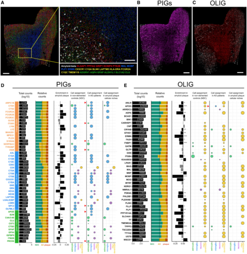 作者使用3名AD患者和3名正常對照組死后的人腦樣本進行實驗。AD大腦處于淀粉蛋白斑C階段和神經(jīng)元糾纏V-VI階段的疾病進展期。研究描繪了與AD相關(guān)的額上回組織譜,總共報告了222個基因表達譜,包括45個人PIGs同源序列,OLIG模塊中42個斑塊反應基因的同源序列,以及一系列細胞類型Marker。這些細胞Marker很好地在細胞分辨率下描繪了大腦區(qū)域(圖7A)。PIG模塊(圖7B,紫色)和OLIG模塊(圖7C,紅色)基因如預期的在大腦灰質(zhì)和白質(zhì)中富集。