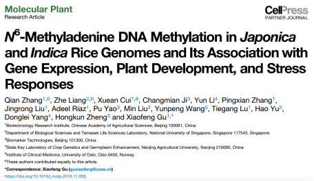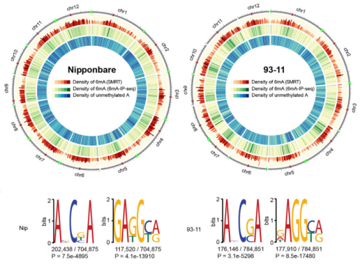 PacBio對粳稻Nip與秈稻93-11基因組更新:利用PacBio對Nip和93-11進(jìn)行測序及Illumina平臺進(jìn)行g(shù)ap填充和誤差校正后,Nip基因組大小為380.7 Mb(contig N50=16.97 Mb),93-11基因組大小為396 Mb(contig N50=9.64 Mb);進(jìn)一步通過SMRT(單分子實時測序系統(tǒng)Single MoleculeReal Time)測序數(shù)據(jù),在Nip和93-11中分別檢測出704875個和784912個6mA位點(diǎn)。