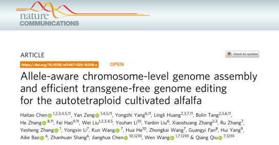 文章中利用了基因組三代測序技術(shù),獲得染色體級別的紫花苜?;蚪M的同時,攻克了同源多倍體物種基因組組裝難題,組裝獲得了4個單倍型紫花苜?;蚪M,為后續(xù)基因編輯研究做了重要的鋪墊,進(jìn)而通過新技術(shù)CRISPR/Cas9基因編輯對控制相應(yīng)表型性狀基因進(jìn)行改造,對于紫花苜蓿后續(xù)分子生物學(xué)研究具有重要而深遠(yuǎn)的意義。