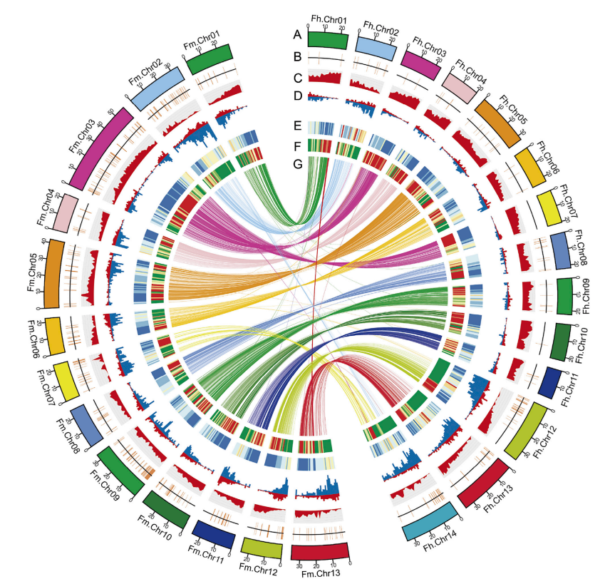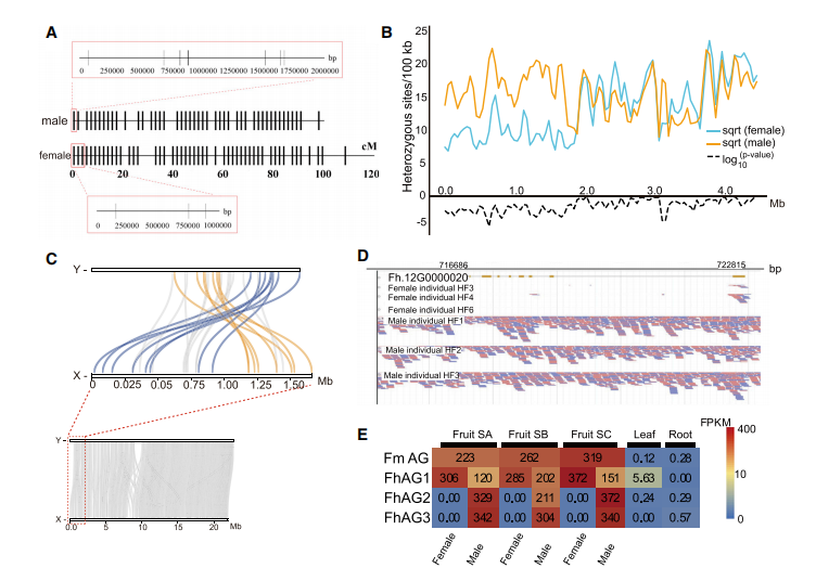 此外,作者新開發(fā)了染色體定相方法并重新組裝了X和Y染色體。X染色體和Y染色體中分別為21.9 Mb和22.6 Mb,表明Y染色體已經(jīng)擴(kuò)展了700 kb(圖3C)。比較X和Y染色體,結(jié)合存在或缺失變異(PAV)分析及RNA-seq分析以及重測序比對,顯示蛋白編碼基因(Fh.12g000020)基因只存在于雄性基因組中,而不存在于雌性基因組中,是影響性別決定的主要因素(圖3E)。
