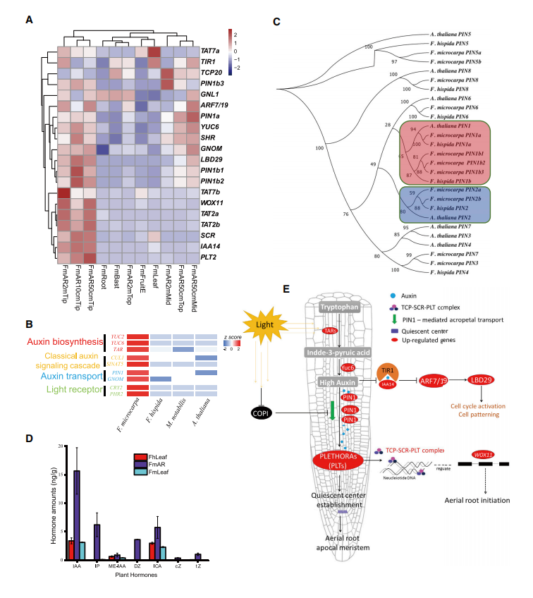 細(xì)葉榕與對葉榕顯著差異表現(xiàn)為前者有氣生根而后者沒有,為了尋找觸發(fā)氣生根的途徑,作者在氣生根尖鑒定到811個高表達(dá)基因。這些高表達(dá)的基因在一系列與運(yùn)輸相關(guān)的生物過程中顯著富集。通過對PIN家族的系統(tǒng)發(fā)育分析,發(fā)現(xiàn)PIN1基因存在顯著的拷貝數(shù)變異(CNV),并確定了兩個進(jìn)化的PIN1亞群。第一組(PIN1a)在兩種榕樹和擬南芥中均被鑒定到,第二組(PIN1b)僅于兩種榕樹中。RNA-seq表明,FmPIN1a在大多數(shù)被測組織中均有表達(dá),而FmPIN1b1、FmPIN1b2FmPIN1b3在氣生根樣品中高表達(dá)。光受體CRY2和PHR2的拷貝數(shù)增加,TAR(如TAT2a、TAT2b和TAT7b)和YUC編碼基因(如YUC6)的表達(dá)增加進(jìn)一步加速了IAA的積累,與對葉榕相比,細(xì)葉榕氣生根尖的內(nèi)源生長素濃度高出5倍。說明生長素的增加引發(fā)了氣生根的發(fā)育,光促進(jìn)的生長素依賴途徑與氣生根的發(fā)生、生長和形態(tài)形成有關(guān)。