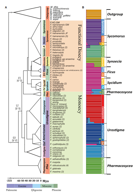 利用112份榕樹材料的基因組重測序數(shù)據(jù),建立了榕樹的系統(tǒng)發(fā)育史,其中包括62種榕樹屬,包括2個雌雄同株亞屬(Pharmacosycea, Urostigma)和4個雌雄異株亞屬(Sycidium,Sycomorus, Synoecia?,Ficus),它們代表了榕樹的6個亞屬和主要分支。白肉榕亞屬(Pharmacosycea)被分至兩類,進(jìn)化樹、ADMIXTURE、遺傳相關(guān)性分析及ABBA-BABA分析發(fā)現(xiàn)了整個屬存在潛在廣泛的種間雜交。系統(tǒng)發(fā)育揭示了雌雄同株代表了整個屬的祖先繁殖系統(tǒng)(圖4)。分化時間顯示,始新世時期(約47.5 Mya)出現(xiàn)了雌雄同株和雌雄異株的分化。