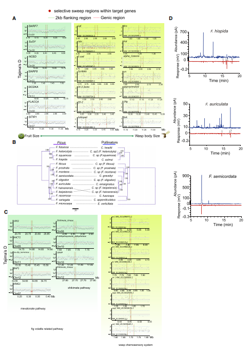七千五百萬年來,榕樹和榕小蜂之間的專性協(xié)同進(jìn)化在這個協(xié)同進(jìn)化系統(tǒng)中形成了形態(tài)和生理上的相適應(yīng)。榕樹在全球和當(dāng)?shù)囟加袠O高的物種多樣性,同域近緣榕果物種間生殖隔離的主要原因是傳粉蜂的特異性。為了探討榕果與傳粉蜂協(xié)同進(jìn)化的潛在分子機(jī)制,作者利用14個來自Sycomorus亞屬的榕樹和其相應(yīng)傳粉蜂的重測序數(shù)據(jù)進(jìn)行分析。系統(tǒng)發(fā)育分析表明,在這個分類水平上,寄主關(guān)聯(lián)具有很強(qiáng)的保守性,同時也檢測到一些寄主轉(zhuǎn)移事件。為了確定在這些協(xié)同進(jìn)化的物種中可能經(jīng)歷了相互選擇和分化的候選基因,作者利用Tajima’D和SweeD分析對榕果和傳粉蜂基因組進(jìn)行了選擇性清除分析,顯示在榕果和傳粉蜂中生長相關(guān)的基因、榕果揮發(fā)物相關(guān)基因和傳粉蜂化學(xué)感應(yīng)系統(tǒng)相關(guān)基因受到一定的選擇作用。并通過榕小蜂對三種不同榕果釋放揮發(fā)物質(zhì)的電生理測試,支持了甲羥戊酸和莽草酸途徑在吸引特定傳粉者方面的重要作用(圖5),揭示了在這種專性互利共生中共分化的潛在分子機(jī)制。