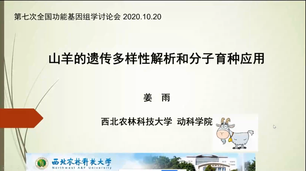 西北農(nóng)林科技大學(xué)姜雨教授風(fēng)趣而系統(tǒng)的解析了世界山羊品種的遺傳來源,并在山羊上鑒定出關(guān)鍵抗病基因MUC6。展示了基于世界主要家畜的SNP和CNV等變異信息和頻率構(gòu)建的家畜遺傳變異數(shù)據(jù)庫。最后表示其研究團隊構(gòu)建了適用于中國綿羊和山羊的基因芯片,將為羊的基因組選擇育種服務(wù),而該芯片也將進入分析應(yīng)用階段。姜老師的研究結(jié)果引起了線上基因組學(xué)相關(guān)領(lǐng)域眾多學(xué)者的熱烈討論。