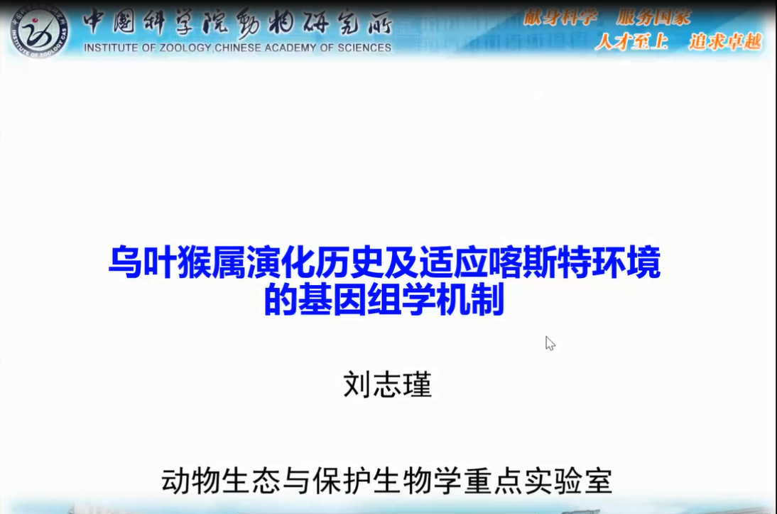 中國科學(xué)院動物研究所劉志瑾副研究員詳述了烏葉猴屬中黑葉猴種組、銀葉猴種組、郁烏葉猴種組三個種組演化地位和種群動態(tài)。并對石山葉猴和雨林葉猴兩大類群以及黑葉猴種組的分化情況進行了深入闡述。研究最后推斷EDNRB基因是在自然選擇過程中,在白頭葉猴遺留下來的環(huán)境適應(yīng)性毛色表型的關(guān)鍵機制。劉老師的報告使相關(guān)領(lǐng)域?qū)W者對靈長類生態(tài)分類群中的基因-環(huán)境相互作用和生理-形態(tài)適應(yīng)機制有了新的認識。