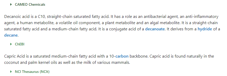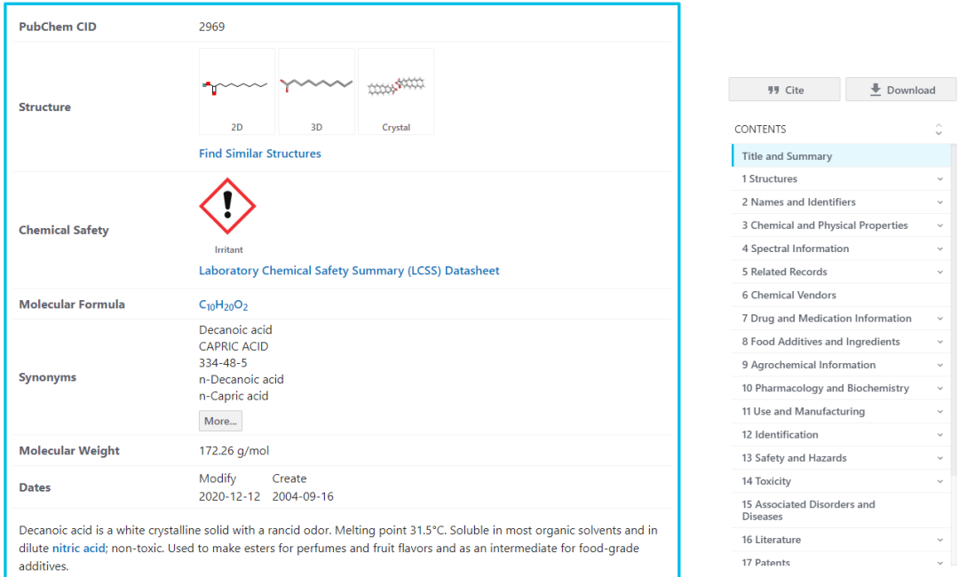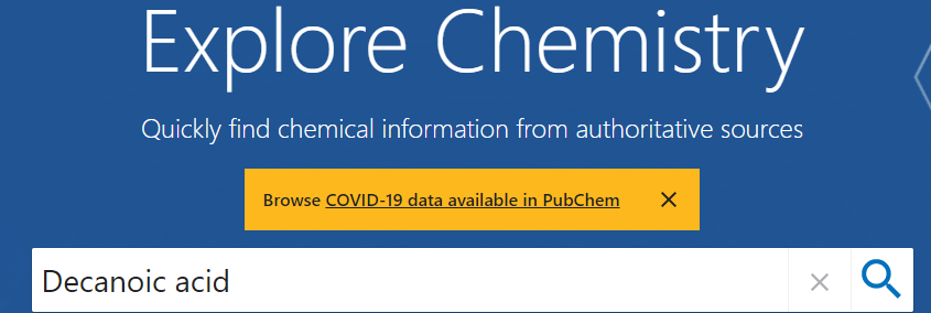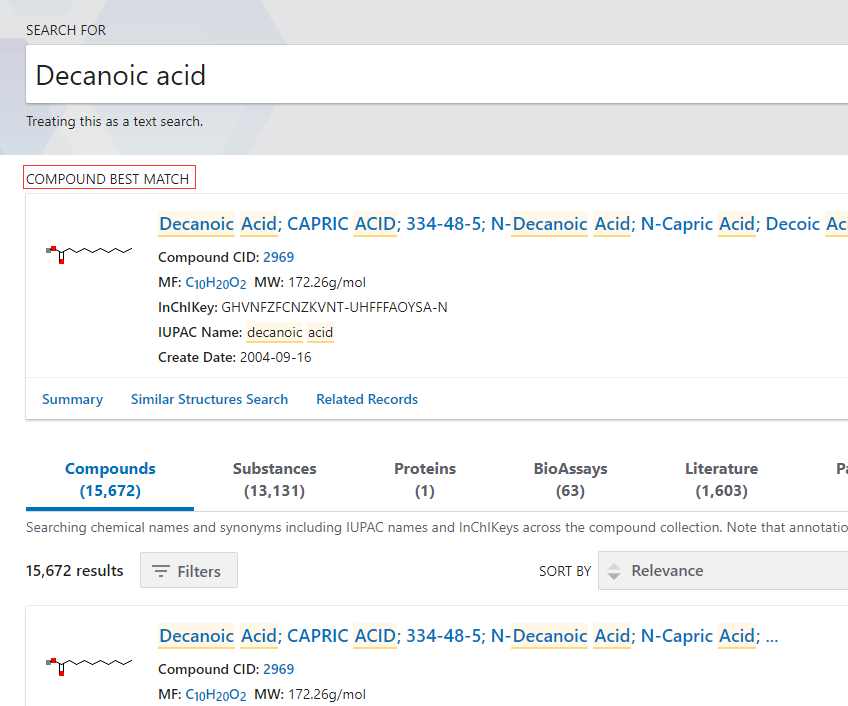 Pubchem(https://pubchem.ncbi.nlm.nih.gov/),它是NCBI下的一個(gè)大型的、綜合性的化合物數(shù)據(jù)庫,目前收錄了1億多種化合物信息,支持名稱、縮寫、化學(xué)式、系統(tǒng)命名等多種方式檢索,其結(jié)果包含了化合物的各種命名、相關(guān)聯(lián)的數(shù)據(jù)庫信息、結(jié)構(gòu)、分類、理化性質(zhì)、文獻(xiàn)、質(zhì)譜圖等多種信息。其中頁面開頭的摘要部分可快速了解到該物質(zhì)的特性、生物功能等信息,根據(jù)提供的文獻(xiàn)信息可幫助我們了解目前的研究情況。今天小編以“癸酸”為例教大家如何快速了解一個(gè)陌生的代謝組化合物。首先我們在主頁搜索欄中輸入癸酸英文名Decanoic acid,點(diǎn)擊搜索后會得到多個(gè)結(jié)果,置頂?shù)囊话銥樽罴哑ヅ洌@里是完全一致的,可以確認(rèn)就是這個(gè)結(jié)果。